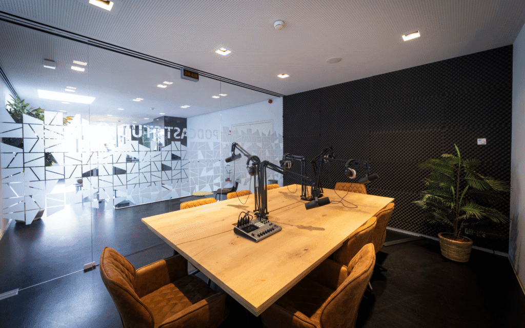 Alles in huis voor jouw succes: HD-ledschermen en projectoren met clickshare technologie, hightech belichtings- en geluidsapparatuur, infrastructuur voor livestreaming, camera’s en online platform.